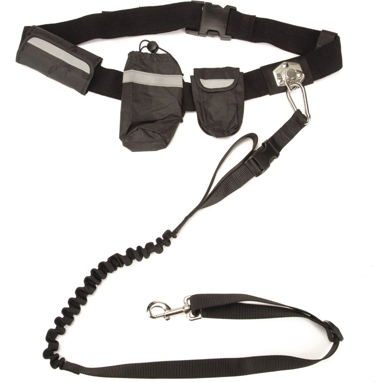 De gordel dient te worden bevestigd om je middel en is voorzien van twee opbergtasjes om bijvoorbeeld koekjes in te doen. De elastische heupriem en looplijn zorgen ervoor dat plotselinge rukbewegingen van de hond worden opgevangen. Bovendien heeft de bevestigingshaak een draaimechaniek waardoor een gedraaide looplijn wordt voorkomen.