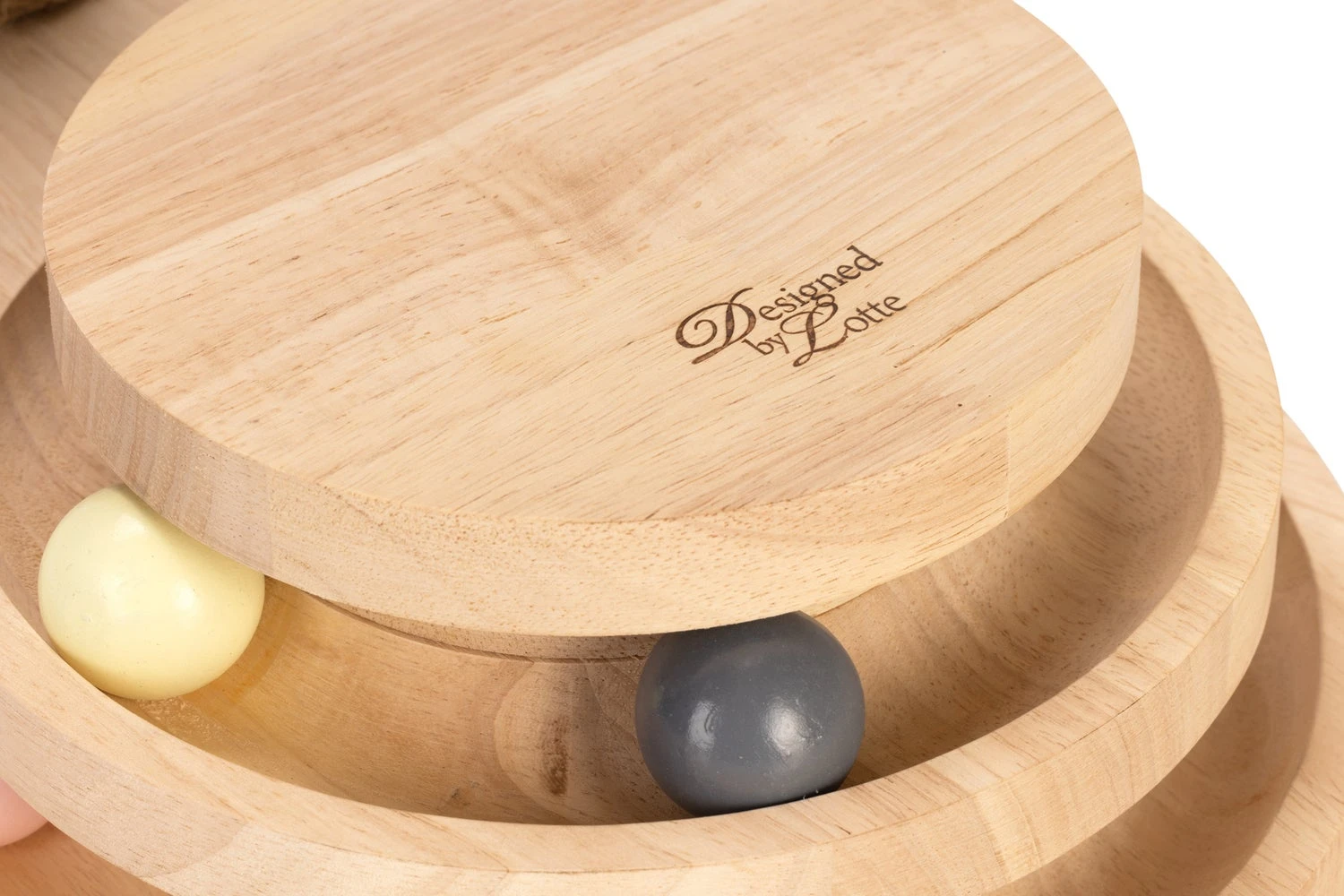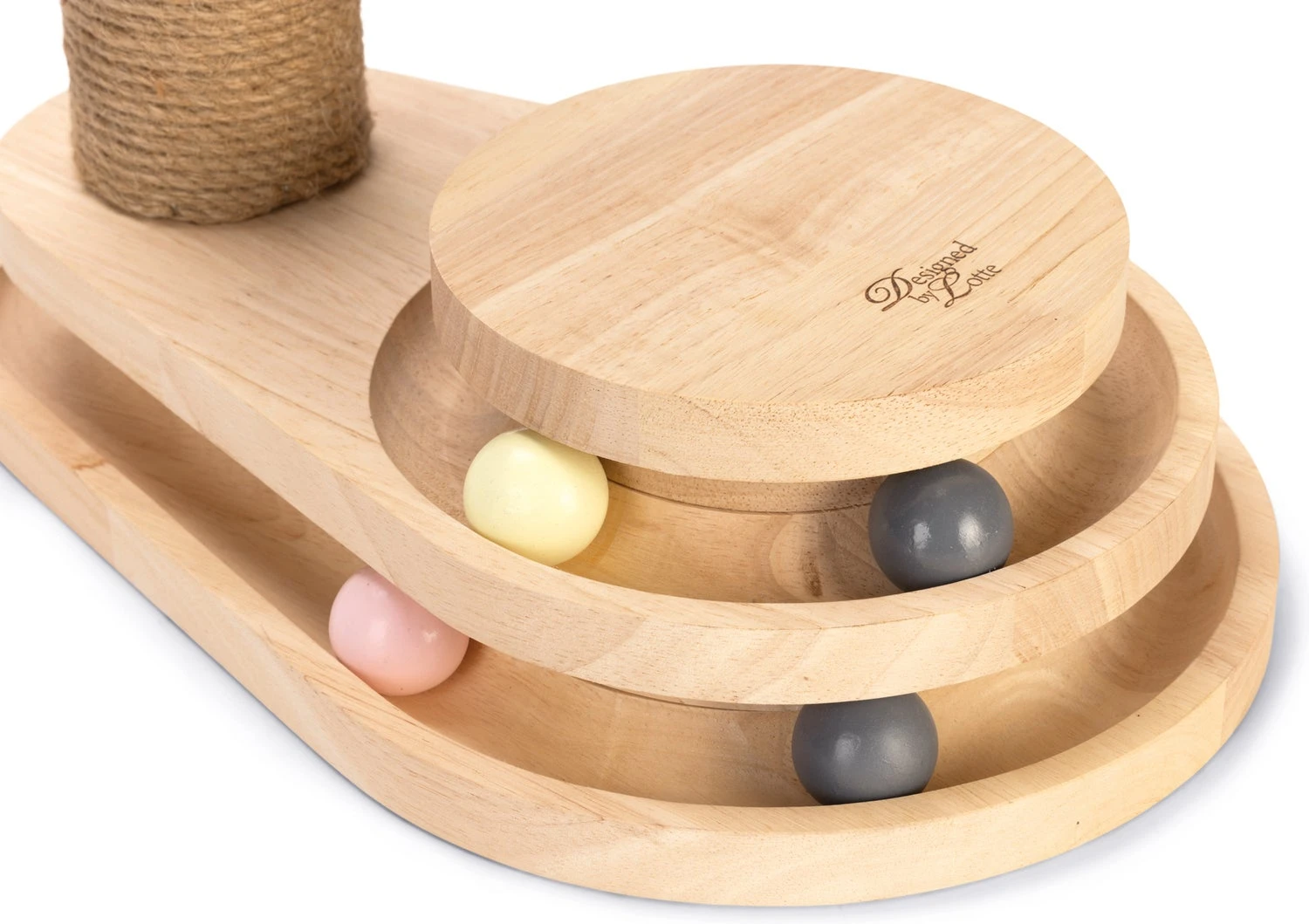 De Designed by Lotte Krabpaal Inez is een multifunctionele krabpaal. Deze krabpaal heeft naast de gebruikelijke krabstam ook nog een leuke speeltoren aan de voet bevestigd. Deze speeltoren is voorzien van balletjes. Zodra jouw kat met zijn poot of snuit tegen de balletjes tikt, zullen deze alle kanten op rollen.