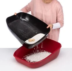 Wanneer je de oude kattenbakvulling moet verwijderen, til je de geperforeerde bodem op en zeef je de bestaande kattenbakvulling. In de zeef blijft de klonterige vulling achter dat moet worden weggegooid, terwijl je in de standaardbodem de nog bruikbare vulling hebt om toe te voegen aan de schone kattenbakvulling.