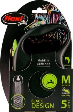 De rollijn Black Design tape van Flexi heeft een strak zwart design met groene details. De hondenriem heeft een maximale vrije looplengte van 5 meter en is ideaal om lange wandelingen mee te maken. Geschikt voor kleine honden tot maximaal 25 kg.