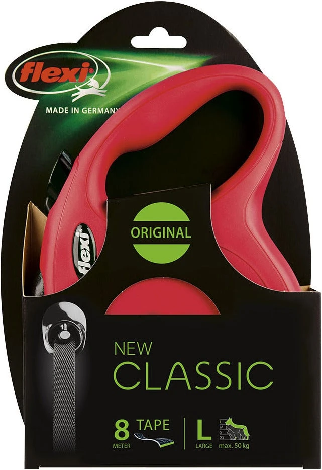 De rollijn Classic Tape van Flexi is een moderne klassieker met een maximale vrije looplengte van 8 meter. Deze hondenriem is geschikt voor grote honden tot ongeveer 50 kg.