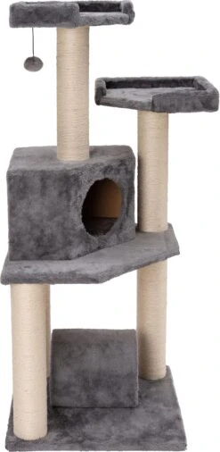 Krabpaal Elise van Intratuin is niet zomaar een krabpaal, het is een heel speel- en rustparadijs voor jouw kat. Het heeft twee hoge plateaus met een opstaand randje, aan één van deze plateaus hangt een balletje waar jouw kat mee kan spelen. In het midden zit een groot plateau met een dichte kattenmand en op de grondplaat is een open cilinder bevestigd om uit te rusten. Door het pluche materiaal is het ook nog eens heerlijk zacht.
